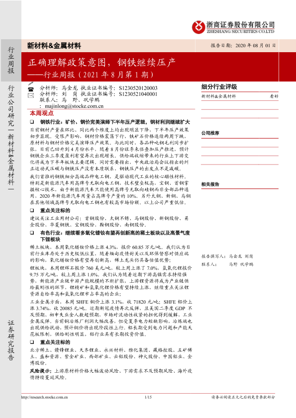 【浙商证券】【20210801】20210801-浙商证券-新材料&金属材料行业周报(2021年8月第1期):正确理解政策意图,钢铁继续压产-15页