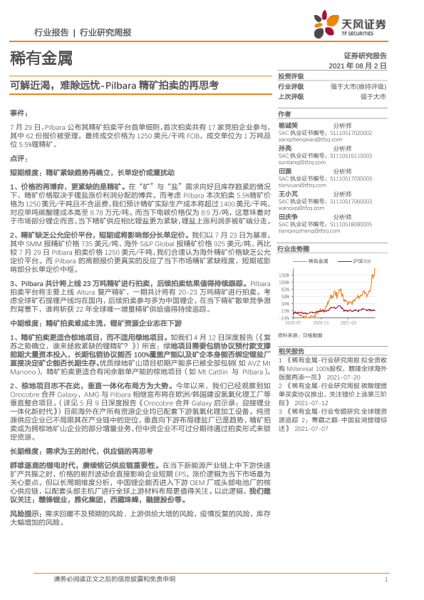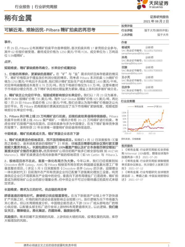 【天风证券】【20210802】20210802-天风证券-稀有金属行业研究周报:可解近渴,难除远忧-Pilbara精矿拍卖的再思考-17页