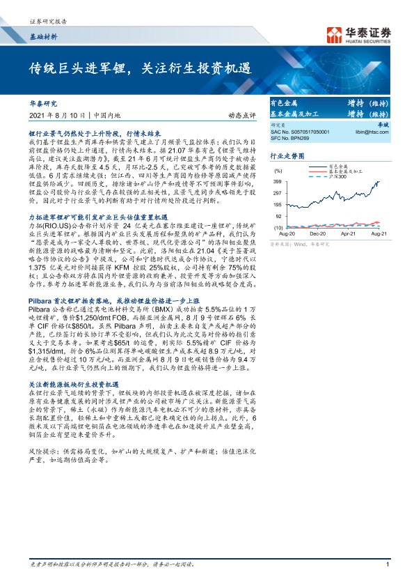 【华泰证券】【20210810】基础材料:传统巨头进军锂,关注衍生投资机遇-5页