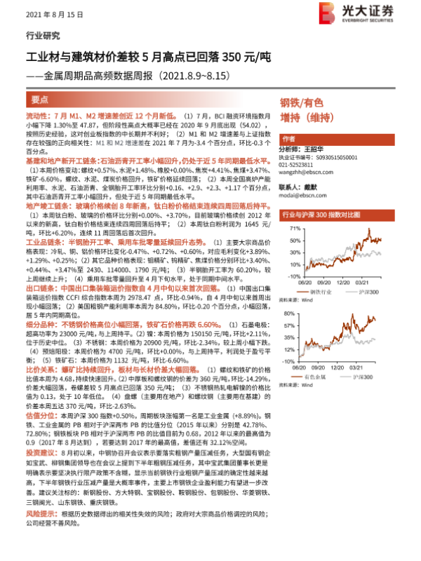 【光大证券】【20210815】金属周期品高频数据周报:工业材与建筑材价差较5月高点已回落350元 吨-24页