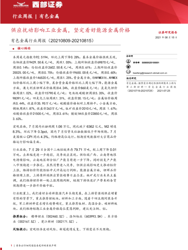 【西部证券】【20210815】20210815-西部证券-有色金属行业周报:供应扰动影响工业金属,坚定看好能源金属价格-14页