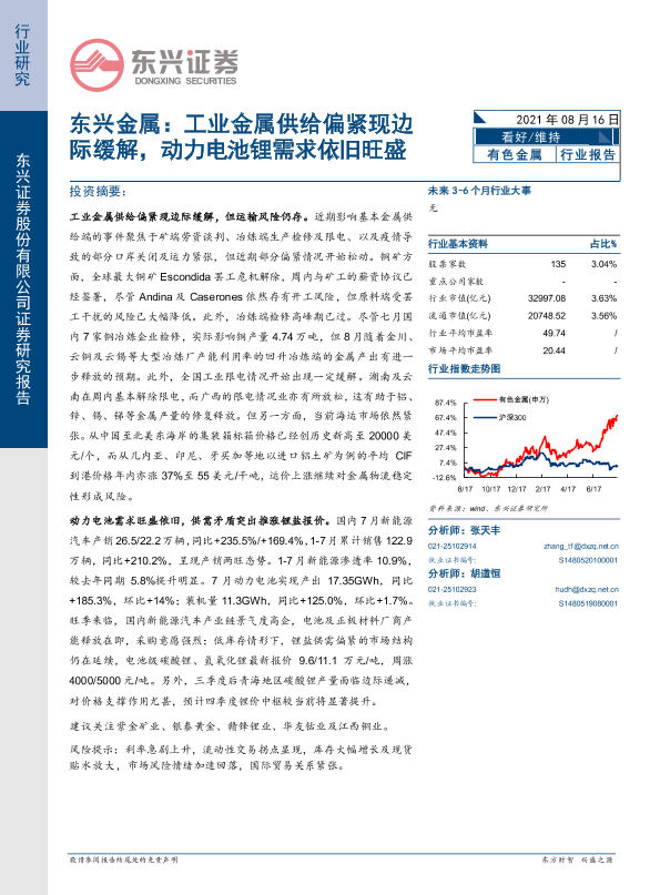 【东兴证券】【20210816】东兴金属:工业金属供给偏紧现边际缓解,动力电池锂需求依旧旺盛-16页