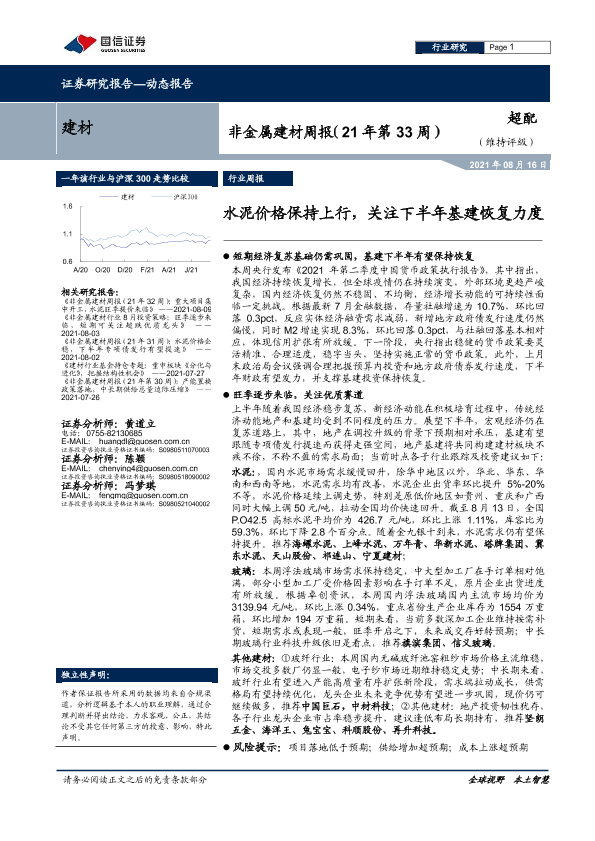 【国信证券】【20210816】非金属建材周报(21年第33周):水泥价格保持上行,关注下半年基建恢复力度-16页