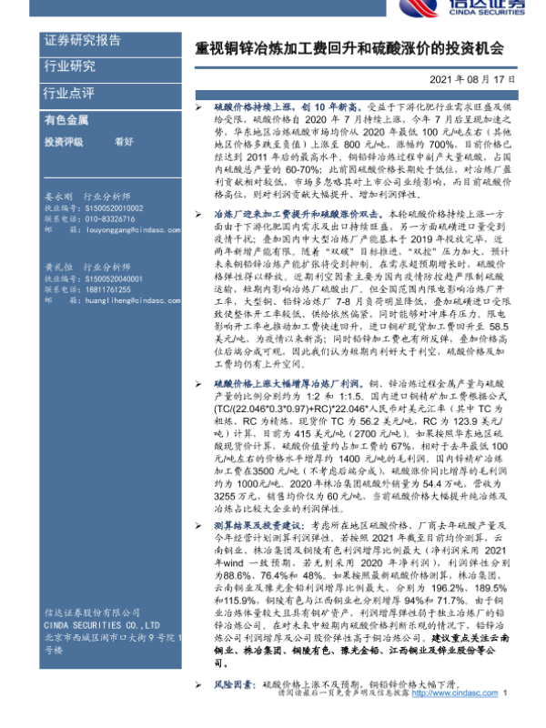 【信达证券】【20210817】重视铜锌冶炼加工费回升和硫酸涨价的投资机会-7页
