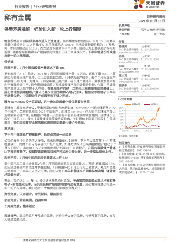 【天风证券】【20210816】20210816-天风证券-稀有金属行业研究周报:供需矛盾难解,锂价进入新一轮上行周期-17页