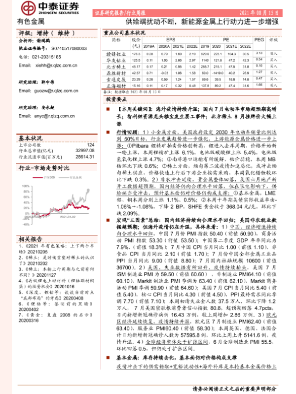 【中泰证券】【20210815】20210815-中泰证券-有色金属行业周报:供给端扰动不断,新能源金属上行动力进一步增强-43页