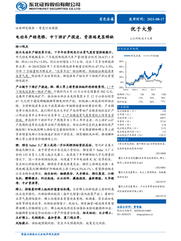 【东北证券】【20210817】20210817-东北证券-有色行业周报:电动车产销亮眼、中下游扩产提速,资源端更显稀缺-18页