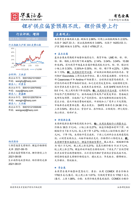 【华安证券】【20210822】20210822-华安证券-有色金属行业周报:锂矿供应偏紧预期不改,锂价强势上行-14页