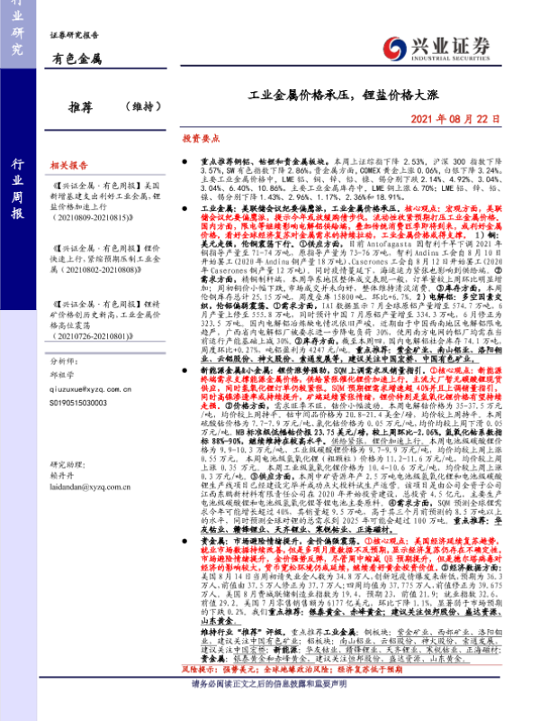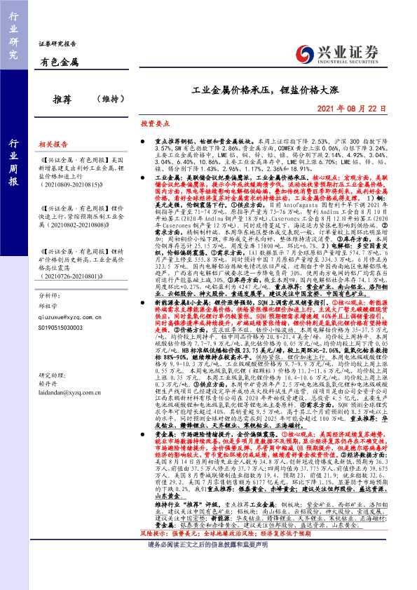 【兴业证券】【20210822】20210822-兴业证券-有色金属行业周报:工业金属价格承压,锂盐价格大涨-23页