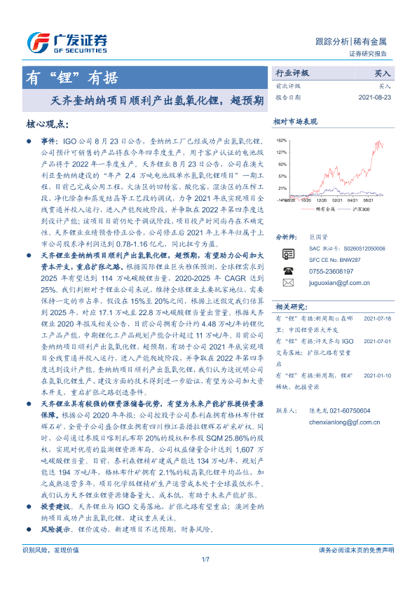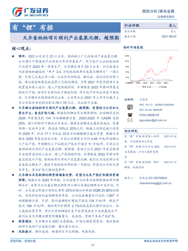 【广发证券】【20210823】有“锂”有据:天齐奎纳纳项目顺利产出氢氧化锂,超预期-7页