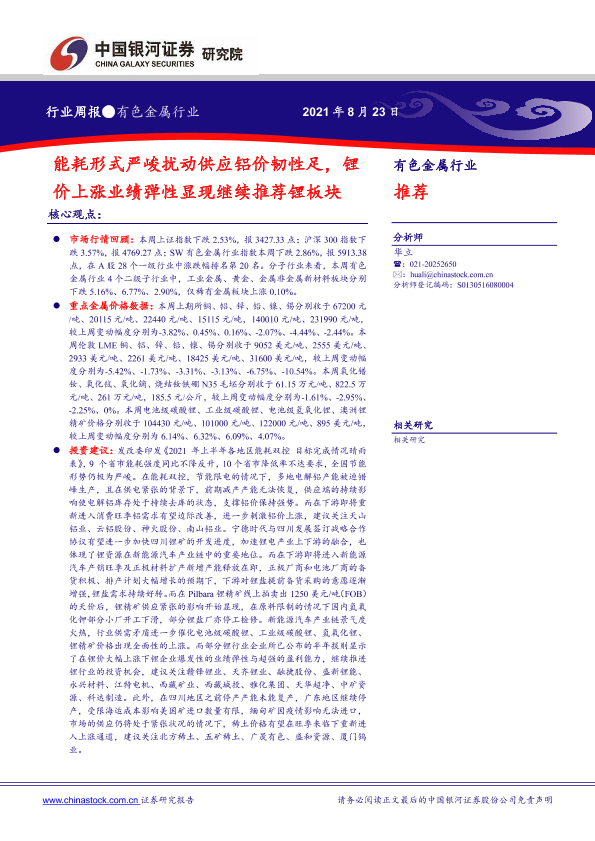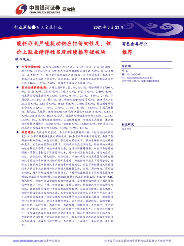 【银河证券】【20210823】20210823-中国银河-有色金属行业周报:能耗形式严峻扰动供应铝价韧性足,锂价上涨业绩弹性显现继续推荐锂板块-20页