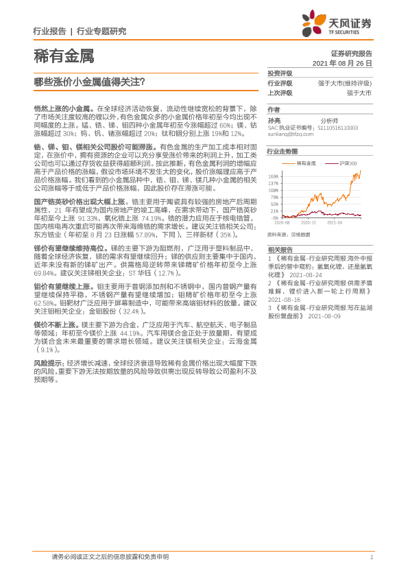 【天风证券】【20210826】稀有金属行业专题研究:哪些涨价小金属值得关注?-6页