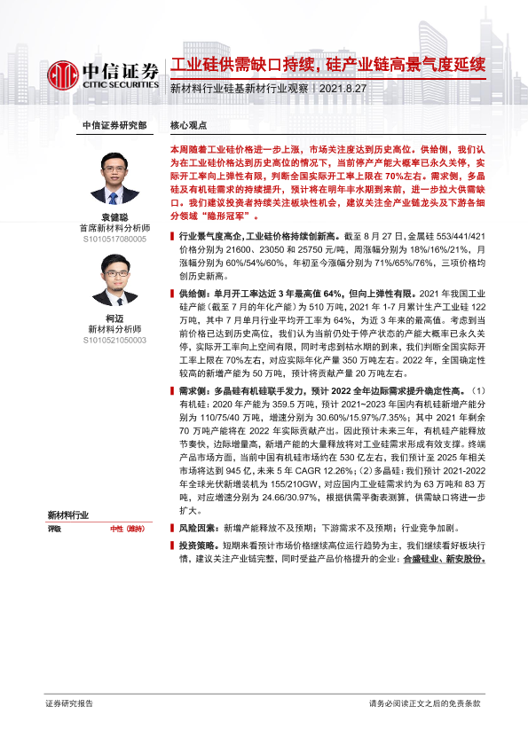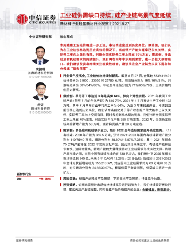 【中信证券】【20210827】新材料行业硅基新材行业观察:工业硅供需缺口持续,硅产业链高景气度延续-7页