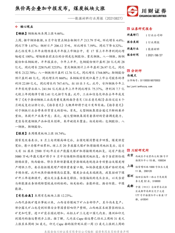 【川财证券】【20210827】能源材料行业周报:焦价高企叠加中报发布,煤炭板块大涨-12页