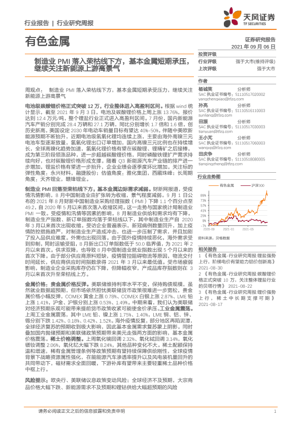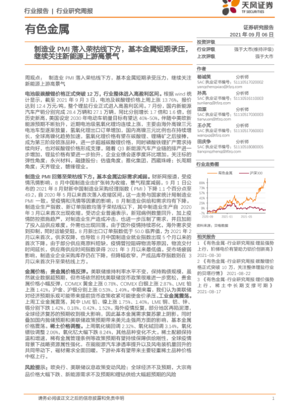【天风证券】【20210906】20210906-天风证券-有色金属行业研究周报:制造业PMI落入荣枯线下方,基本金属短期承压,继续关注新能源上游高景气-12页