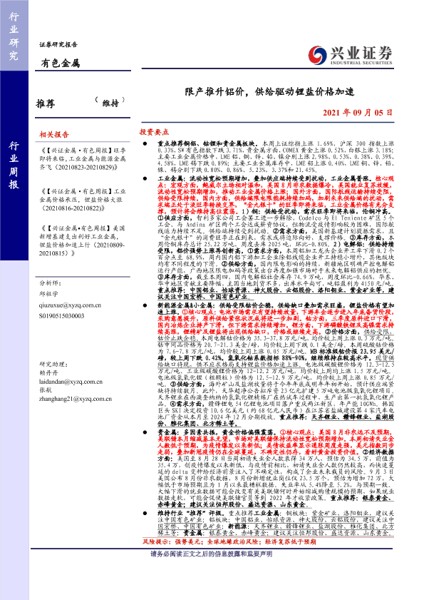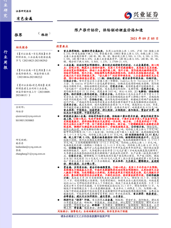 【兴业证券】【20210905】20210905-兴业证券-有色金属行业周报:限产推升铝价,供给驱动锂盐价格加速-22页
