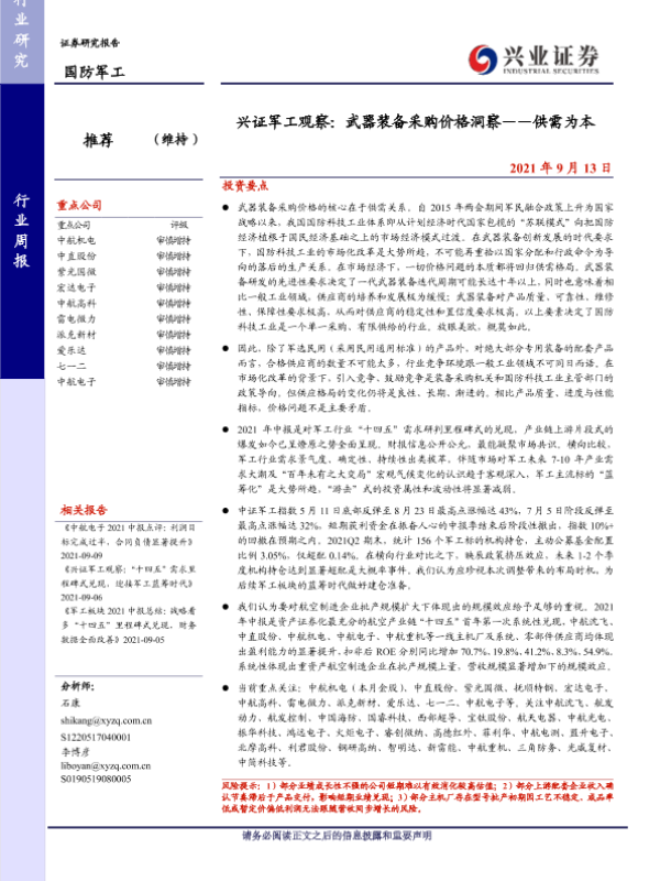 【兴业证券】【20210913】兴证军工观察:武器装备采购价格洞察——供需为本-16页