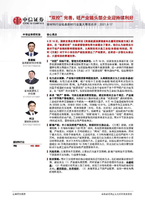 【中信证券】【20210917】新材料行业硅基新材行业重大事项点评:“双控”完善,硅产业链头部企业迎持续利好-4页