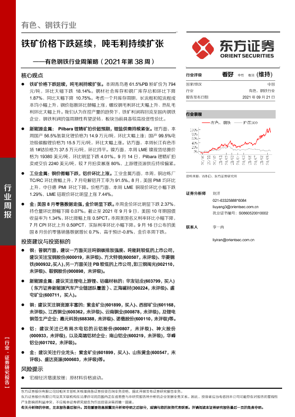 【东方证券】【20210921】有色钢铁行业周策略(2021年第38周):铁矿价格下跌延续,吨毛利持续扩张-27页