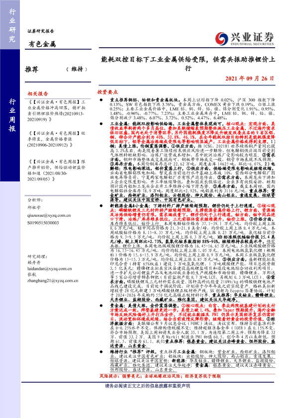 【兴业证券】【20210926】20210926-兴业证券-有色金属行业周报:能耗双控目标下工业金属供给受限,供需共振助推锂价上行-22页