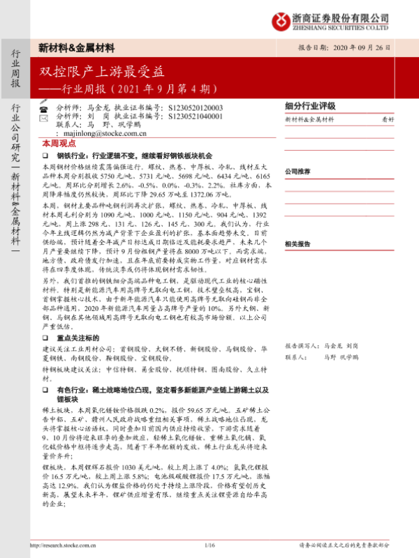 【浙商证券】【20210926】20210926-浙商证券-新材料&金属材料行业周报(2021年9月第4期):双控限产上游最受益-16页