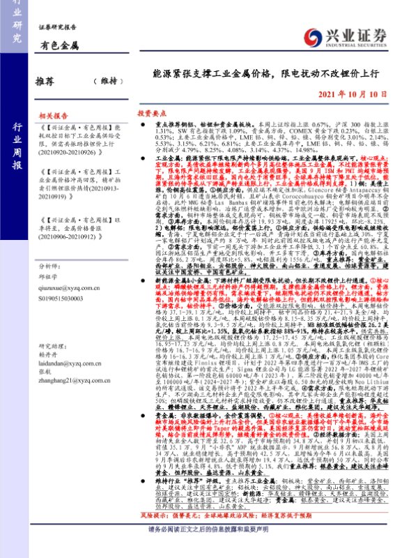 【兴业证券】【20211010】20211010-兴业证券-有色金属行业周报:能源紧张支撑工业金属价格,限电扰动不改锂价上行-24页