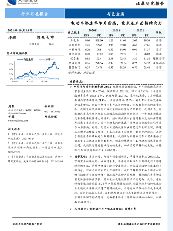 【财信证券】【20211014】财信证券-有色金属行业月度报告:电动车渗透率单月新高,需求基本面持续向好-14页