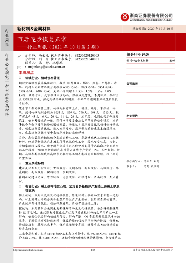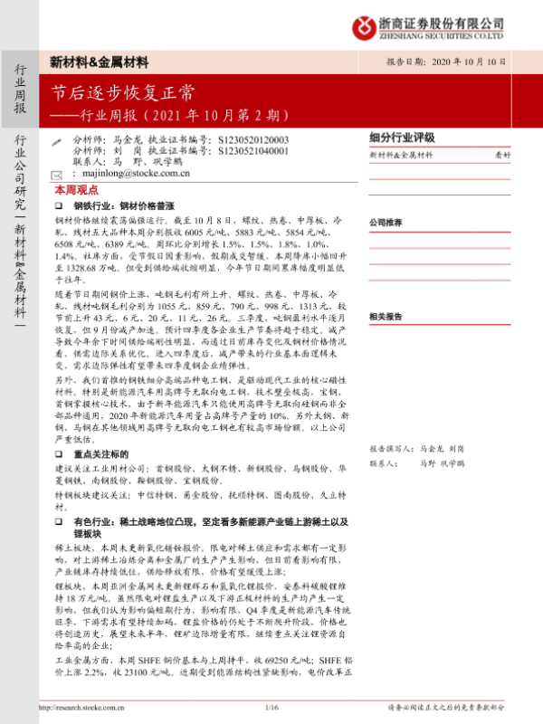 【浙商证券】【20211010】20211010-浙商证券-新材料&金属材料行业周报(2021年10月第2期):节后逐步恢复正常-16页