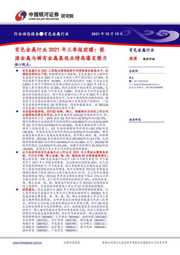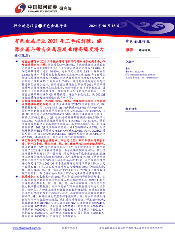 【银河证券】【20211015】有色金属行业2021年三季报前瞻:能源金属与稀有金属展现业绩高爆发潜力-12页