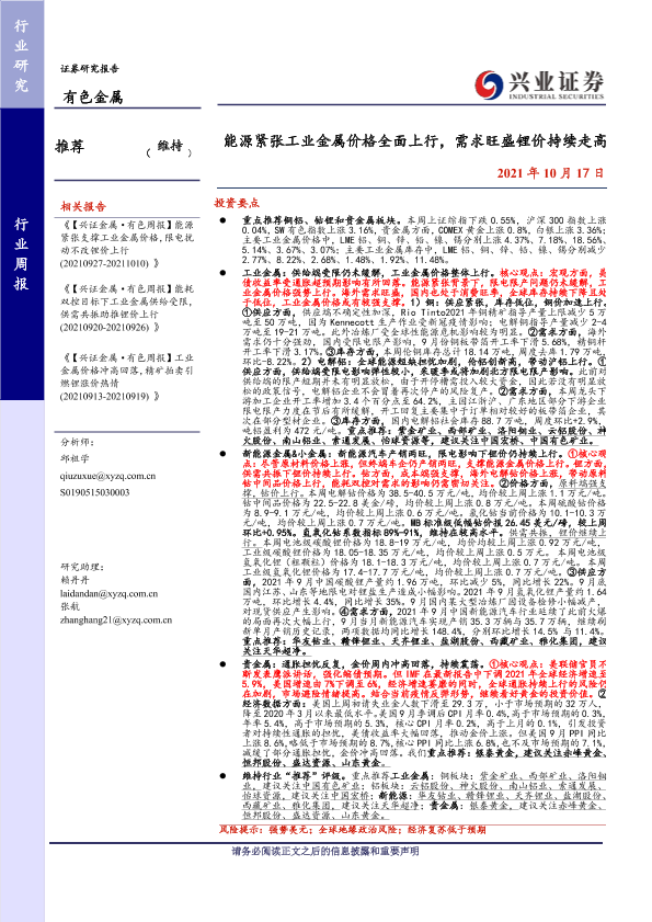 【兴业证券】【20211017】20211017-兴业证券-有色金属行业周报:能源紧张工业金属价格全面上行,需求旺盛锂价持续走高-22页
