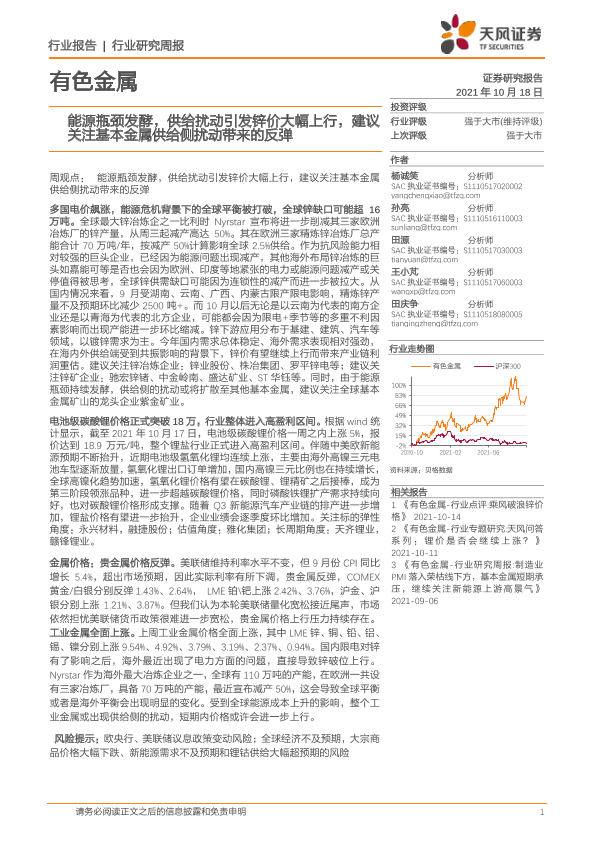 【天风证券】【20211018】20211018-天风证券-有色金属行业研究周报:能源瓶颈发酵,供给扰动引发锌价大幅上行,建议关注基本金属供给侧扰动带来的反弹-13页