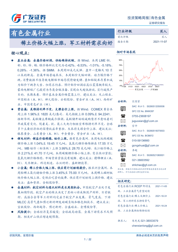 【广发证券】【20211107】20211107-广发证券-有色金属行业:稀土价格大幅上涨,军工材料需求向好-22页