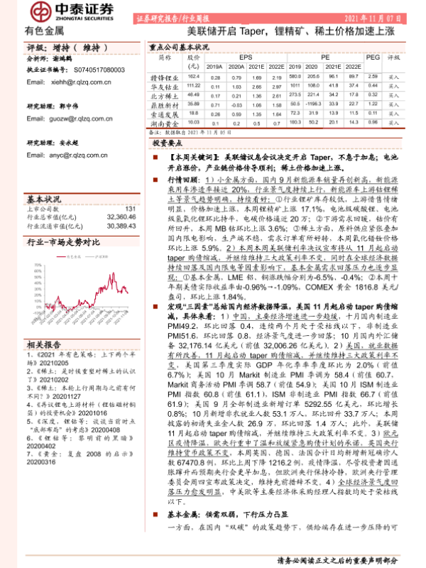 【中泰证券】【20211107】20211107-中泰证券-有色金属行业周报:美联储开启Taper,锂精矿、稀土价格加速上涨-47页