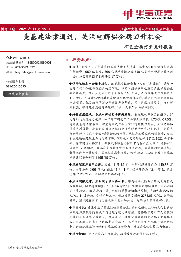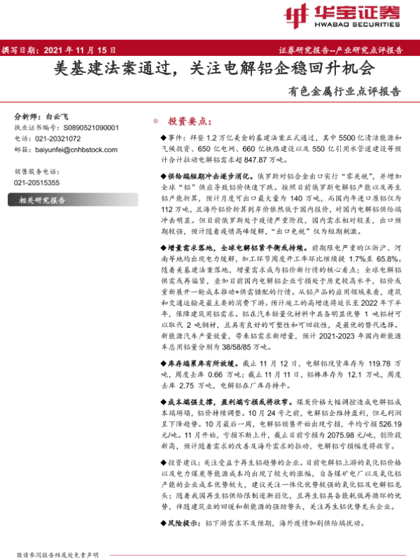 【华宝证券】【20211115】20211115-华宝证券-有色金属行业点评报告:美基建法案通过,关注电解铝企稳回升机会-3页
