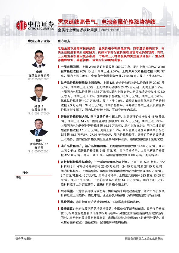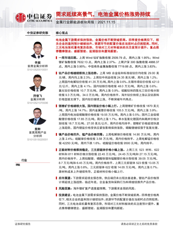 【中信证券】【20211115】金属行业新能源板块周报:需求延续高景气,电池金属价格涨势持续-15页
