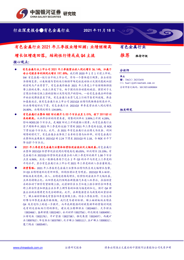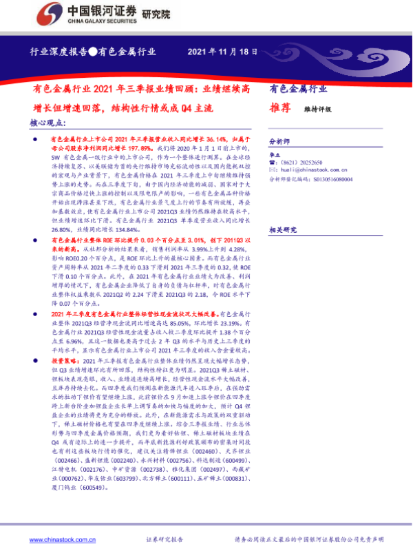 【银河证券】【20211118】有色金属行业2021年三季报业绩回顾:业绩继续高增长但增速回落,结构性行情或成Q4主流-18页