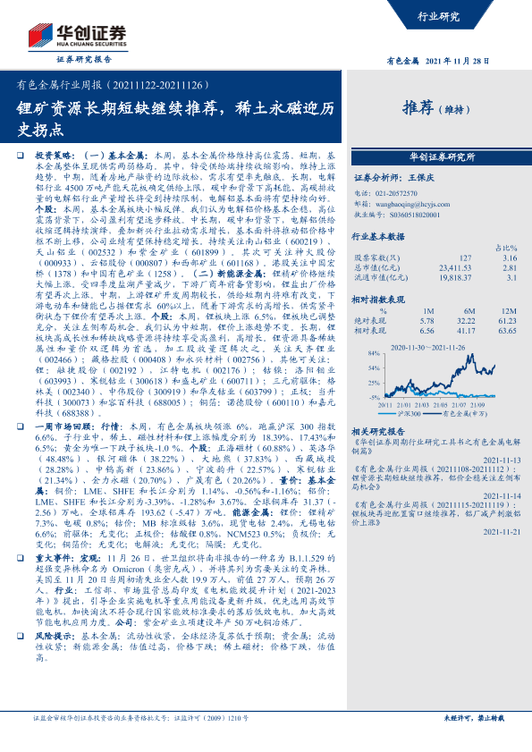【华创证券】【20211128】20211128-华创证券-有色金属行业周报:锂矿资源长期短缺继续推荐,稀土永磁迎历史拐点-16页