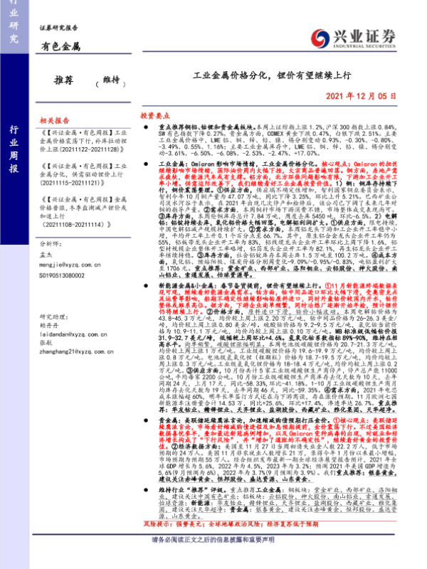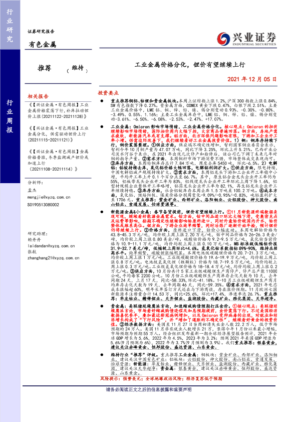 【兴业证券】【20211205】20211205-兴业证券-有色金属行业周报:工业金属价格分化,锂价有望继续上行-21页