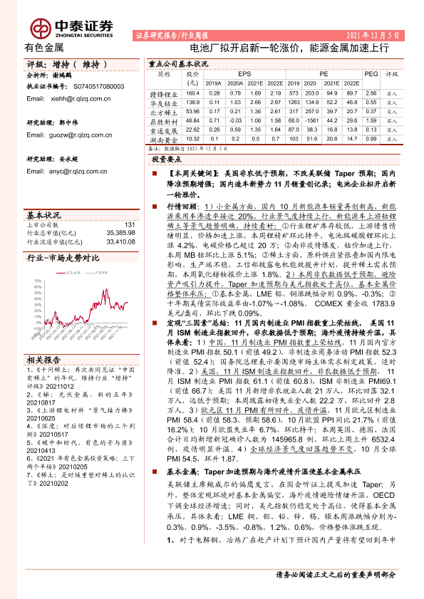 【中泰证券】【20211205】20211205-中泰证券-有色金属行业周报:电池厂拟开启新一轮涨价,能源金属加速上行-46页