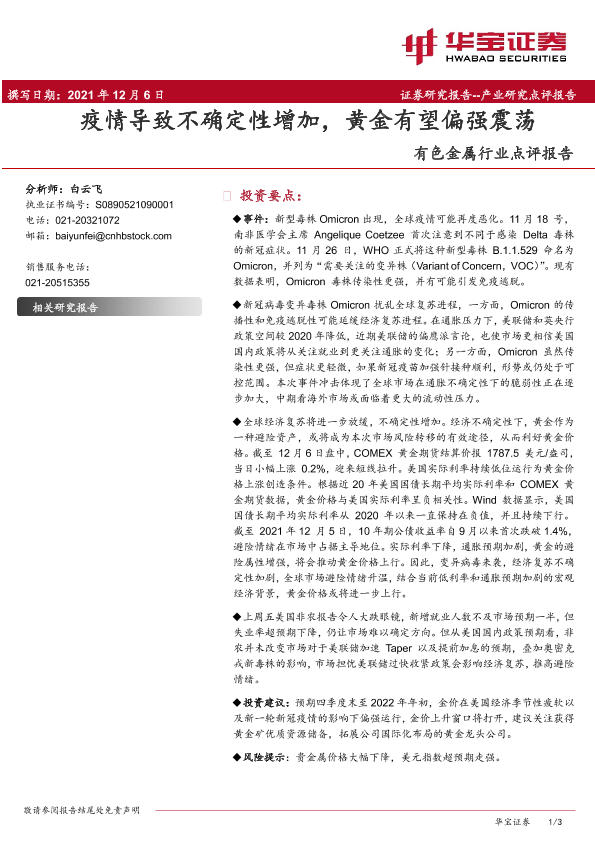 【华宝证券】【20211206】疫情导致不确定性增加,黄金有望偏强震荡-3页