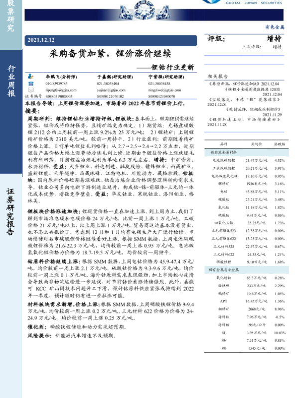 【国泰君安证券】【20211212】采购备货加紧,锂价涨价继续——锂钴行业更新-13页