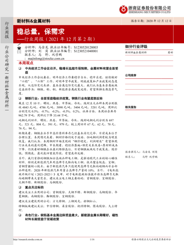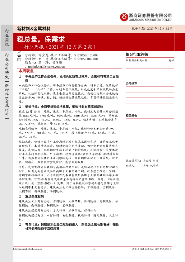 【浙商证券】【20211212】20211212-浙商证券-新材料&金属材料行业周报(2021年12月第2期):稳总量,保需求-16页