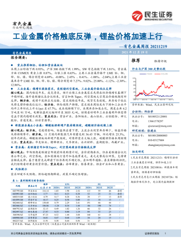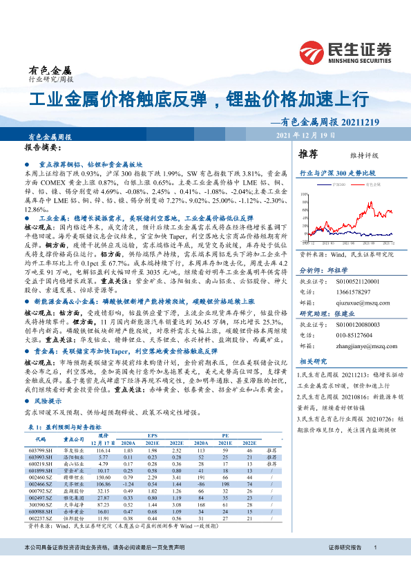 【民生证券】【20211219】20211219-民生证券-有色金属周报:工业金属价格触底反弹,锂盐价格加速上行-26页