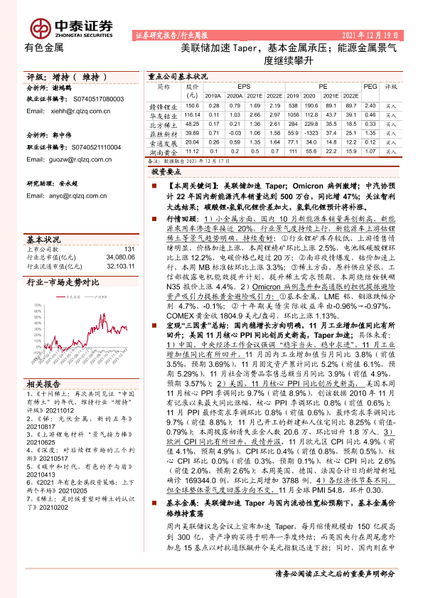 【中泰证券】【20211219】20211219-中泰证券-有色金属行业周报:美联储加速Taper,基本金属承压;能源金属景气度继续攀升-46页