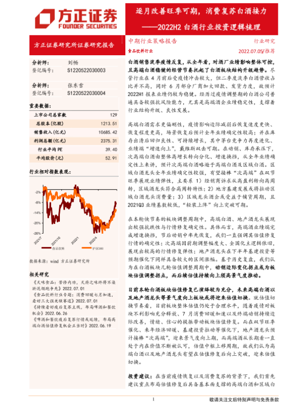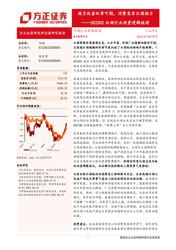 【方正证券】【20220705】2022H2白酒行业投资逻辑梳理:逐月改善旺季可期,消费复苏白酒接力-19页