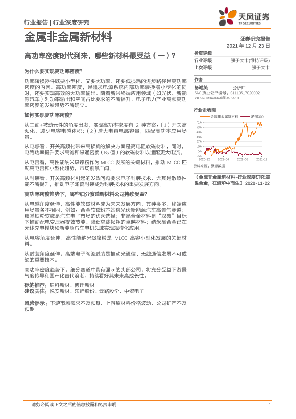 【天风证券】【20211223】金属非金属新材料:高功率密度时代到来,哪些新材料最受益(一)?-18页