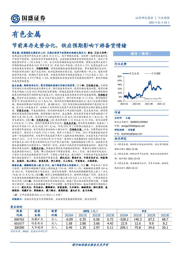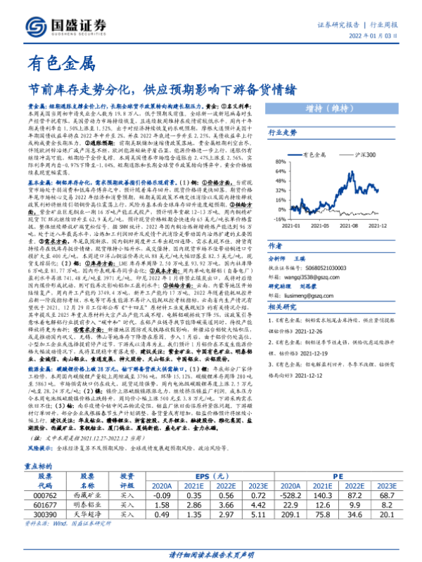 【国盛证券】【20220103】有色金属行业周报:节前库存走势分化,供应预期影响下游备货情绪-20页