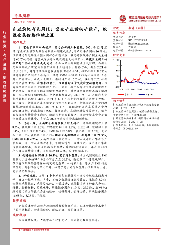 【东亚前海证券】【20220103】东亚前海有色周报:紫金矿业新铜矿投产,能源金属价格持续上涨-22页