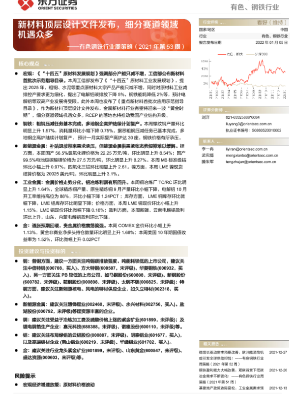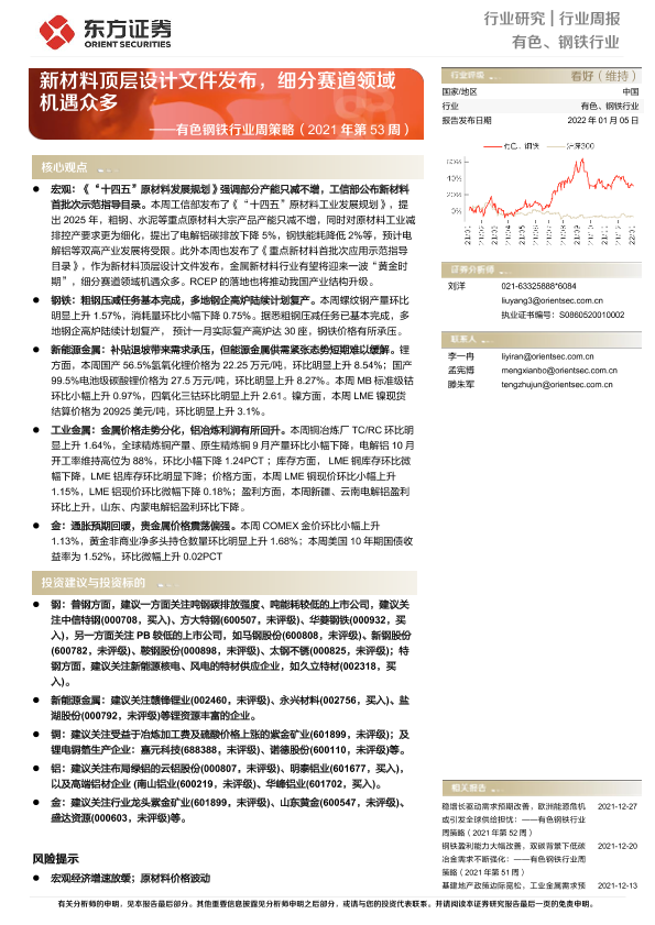 【东方证券】【20220105】有色钢铁行业周策略(2021年第53周):新材料顶层设计文件发布,细分赛道领域机遇众多-37页