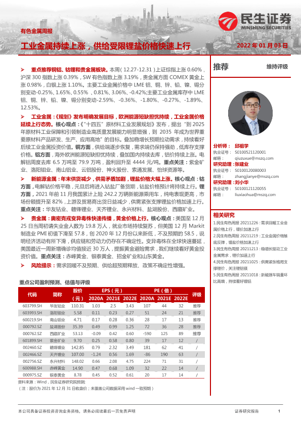 【民生证券】【20220103】20220103-民生证券-有色金属周报:工业金属持续上涨,供给受限锂盐价格快速上行-25页
